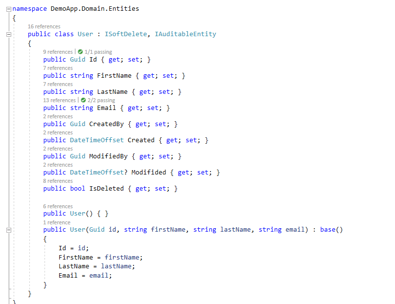 Now, let’s have a look at User Entity which has implemented ISoftDelete and IAuditableEnttity. I have also added a parameterized constructor to support UserBuilder Class in UnitTesting.