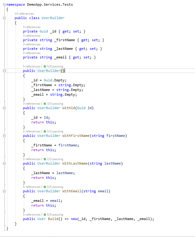 Let’s use the builder pattern to create a UserBuilder class. This will contain all or few properties that we are gonna use for Unit Testing, basically the fields that are required for business flow verifications.