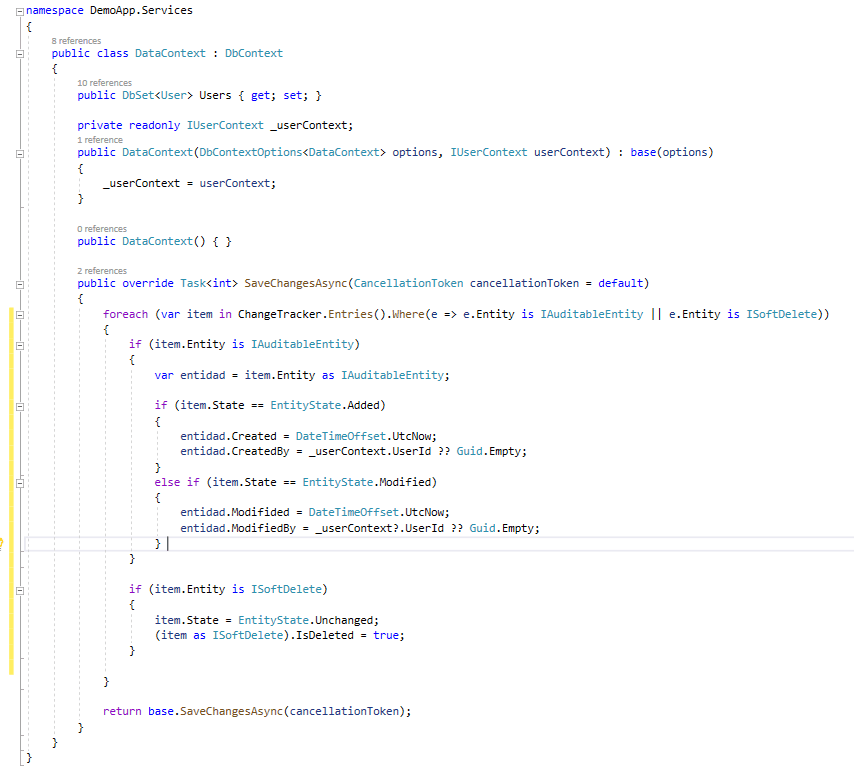Note: You will notice a few additional code snippets on Soft Deletion, use of auditable entities and accessing request context values to make a demo application almost similar to production scenario.