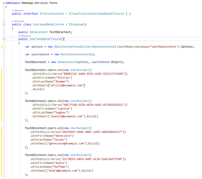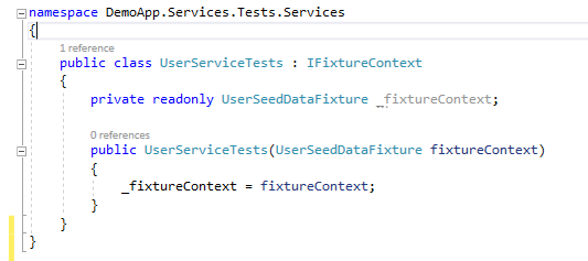 One last thing before jumping to Unit Test Project is to set up a class Fixture. Ultimate goal of this class is to share the TestDataContext throughout the same class test execution.